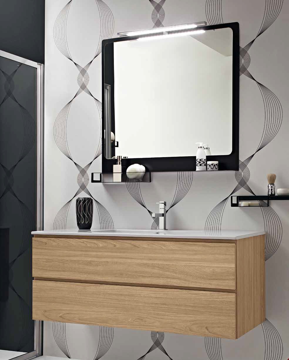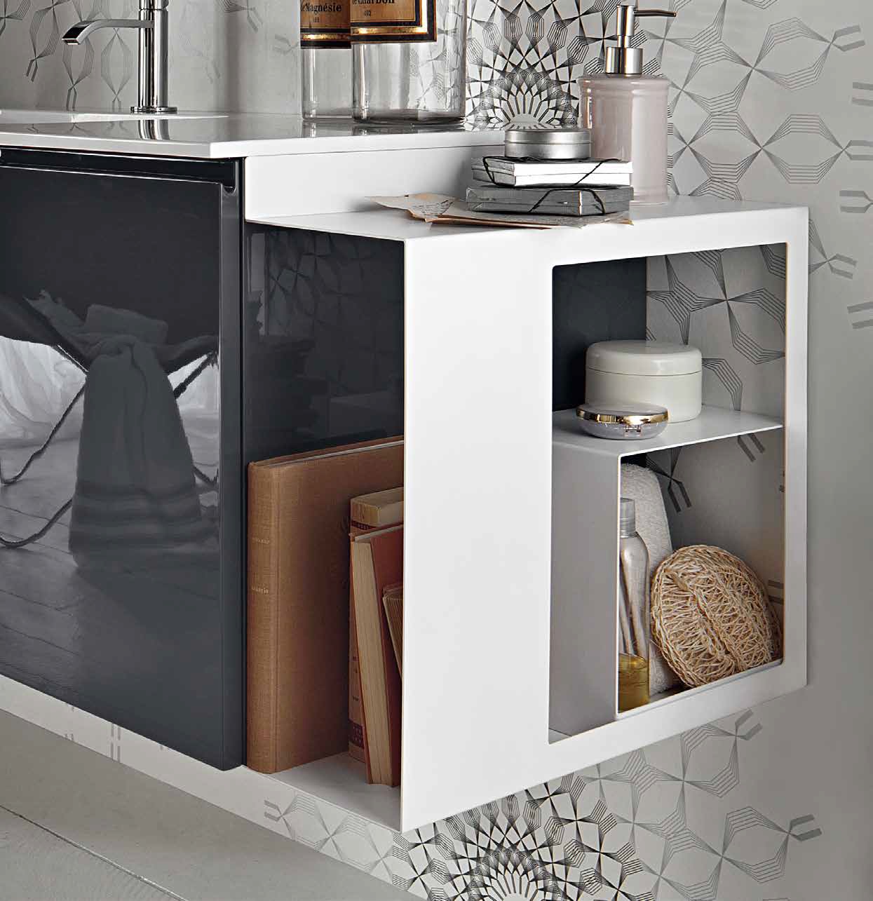 Collezione per l’arredo bagno con maniglia integrata nel frontale che esalta lo stile minimalista del design. Si presta a molteplici soluzioni anche grazie alla possibilità di scegliere fra la finitura Olmo Leone in 3 varianti e 25 colori laccati opachi e lucidi (vedi sezione Finiture). La sua funzionalità è ampliata dal marsupio portaoggetti in metallo verniciato, che si può fissare sul lato destro o sinistro. Il tutto è completato da una specchiera coordinata e da mensole e scatole portaoggetti in metallo verniciato.