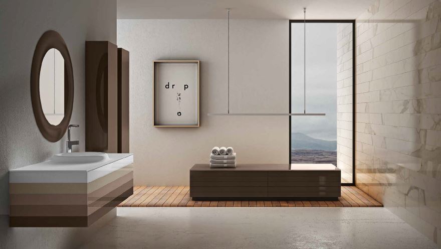 mobile lavabo nella gradazione moka lucido lavabo “Etna” e rubinetto serie “tono” specchiera “circle” con