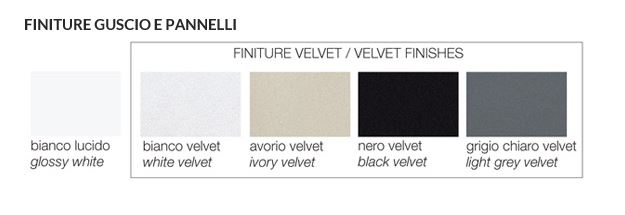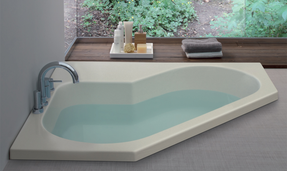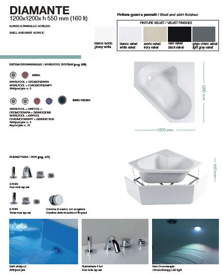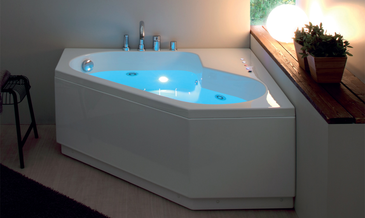 Un’estetica geometricamente lineare, vasca ad angolo con un bacino ampio e comodo. La fascia di appoggio a terra arretrata leggermente rispetto alla pannellatura le dona leggerezza e arricchisce il gioco di colore possibile con le combinazioni offerte. Disponibile nella versione basic o idromassaggio e cromoterapia può essere accessoriata con il gruppo rubinetto tradizionale a 4 fori o a tre fori con colonna di scarico con erogatore.