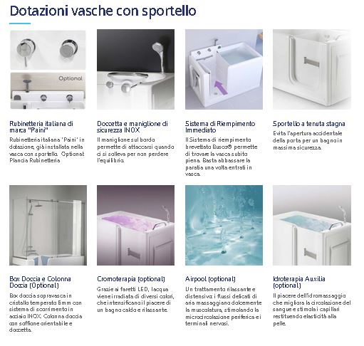 Una vasca con sportello composta da sedile e paratia mobile incernierata al sedile che la divide in 2 parti. La prima parte è destinata al riempimento mentre l’altra rimane vuota per permettervi di entrare. Una volta entrati in vasca è sufficente chiudere lo sportello ed abbassare la paratia verso il sedile in questo modo l’acqua defluirà rapidamente riempendo la tua vasca con sportello in un istante.