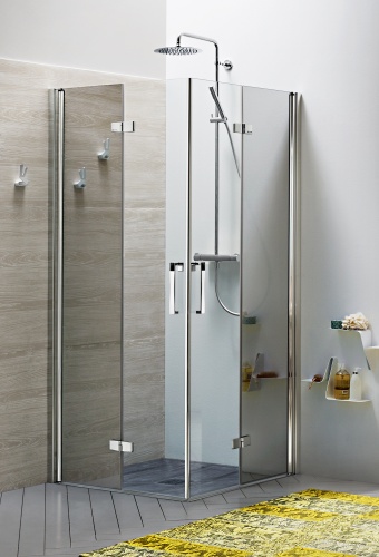 Box Doccia senza telaio, in cristallo temperato da 6mm, finiture: Trasparente, Serigrafato o Specchiato, altezza 195 cm. Profili in alluminio con finitura argento lucido.