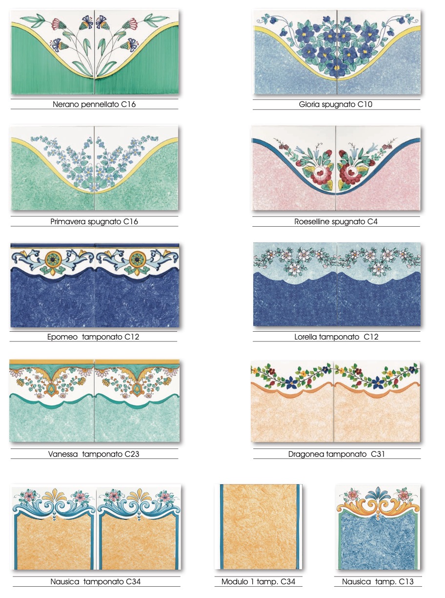 i mastri decoratori usano la tecnica dello “spolvero” che lascia sullo smalto della polvere di carbone che trac- cia il disegno, che viene completato con la filettatura di quest’ultimo con appositi pennelli sottili, e successiva- mente con l’applicazione dei vari colori.