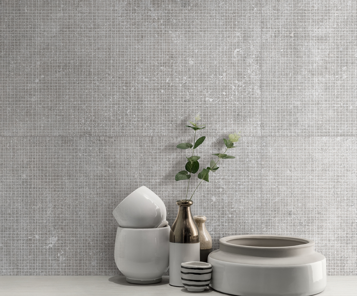 Una serie di leggere e quasi impercettibili trame decorative geometriche e una ricca gamma di formati permettono di ottenere infinite composizioni dando movimento alle superfici.