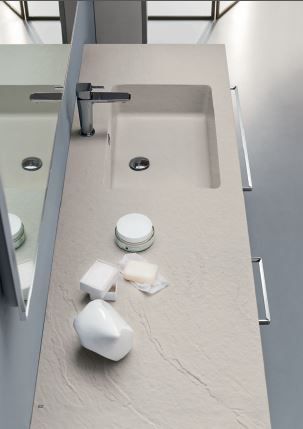 Il colore si amalgama ai materiali e li valorizza: l’effetto pietra dà profondità e carattere al Grigio Atlantico e, quest’ultimo, risponde facendone risaltare la forza espressiva.