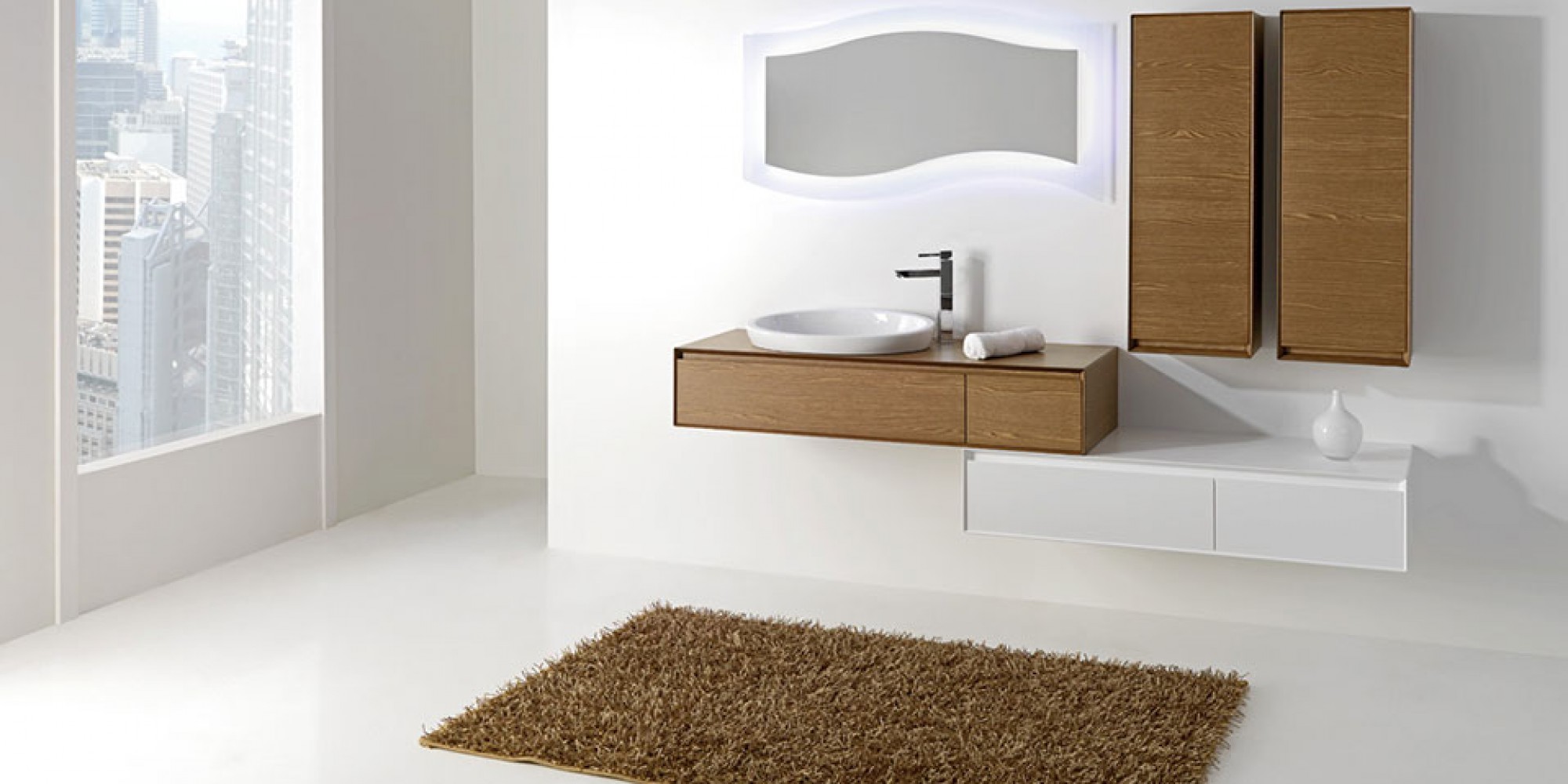 Composizione da 207cm con frontali e Scocca in olmo spazzolato. Tinto tabacco/ Laccato bianco opaco.Specchio retroilluminato a led rgb a5 colori