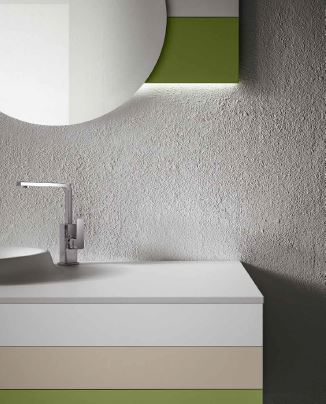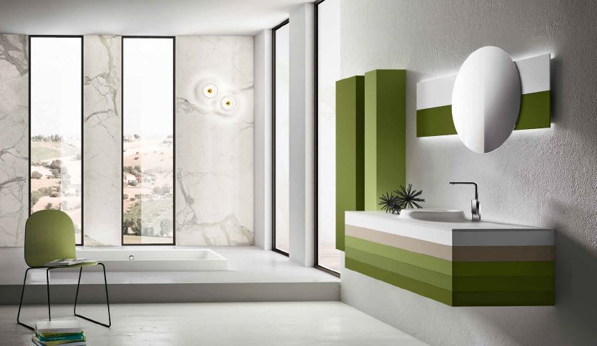 mobile lavabo nella gradazione verde opaco lavabo “Etna” e rubinetto serie “profili” alto specchiera “round” con fasce opache in tinta con il mobile e luce led colonne sospese nei colori della gradazione verde opaco.