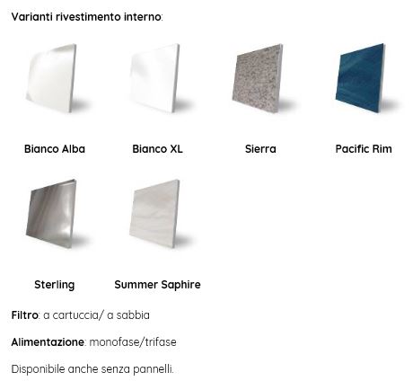 Il guscio di ogni minipiscina è interamente ricoperto di fibra di vetro ad “alta densità” e di un isolante in poliuretano mentre i pannelli laterali sono rivestiti internamente di fogli di alluminio con “bi-isolante” termico ed acustico.