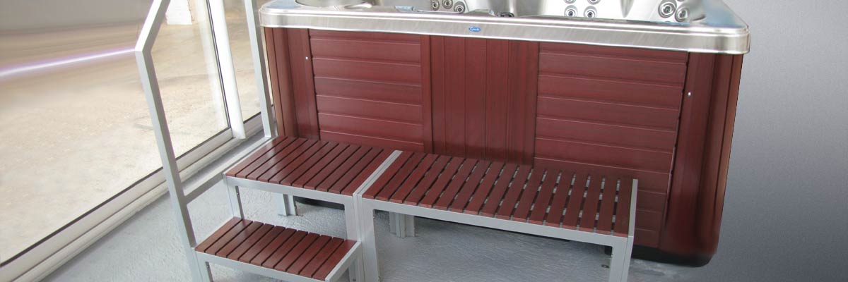 - simil rattan (non disponile per il modello R 200): in questo caso la scaletta di accesso con corrimano e panca laterale sono in color legno scuro.