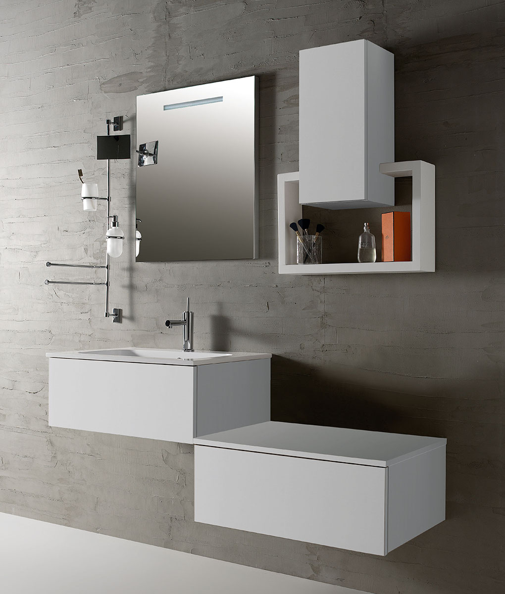 Base porta lavabo con un cassettone da 70 cm e base laterale con un cassettone da 70 cm Top in melaminico da 70 cm, Specchio retroilluminato, Pensile basso ad 1 anta da 25 cm e mensola. Profondità mobile 48 cm.