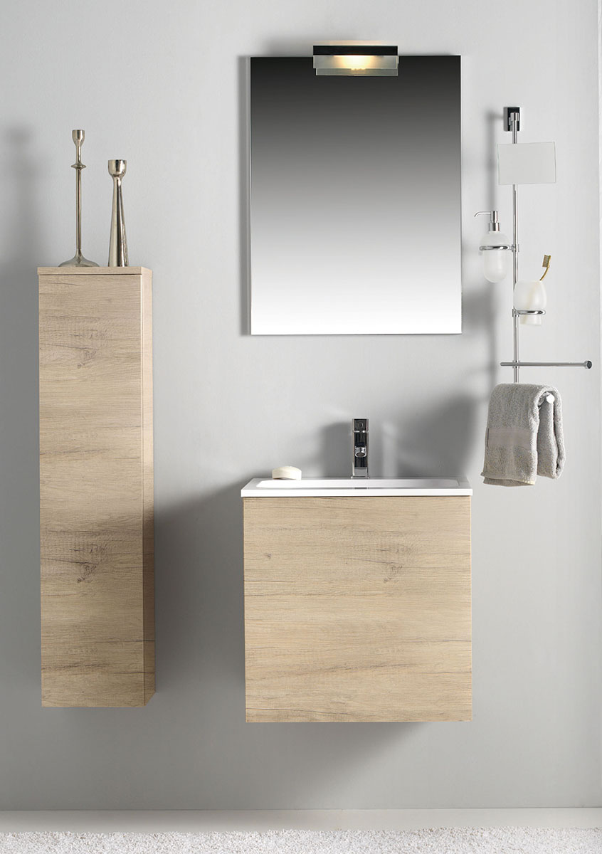 Base porta lavabo con un cassettone da 55cm Specchio a giorno, Pensile alto con 1 anta da 25 cm e lampada. Profondità mobile 48 cm.