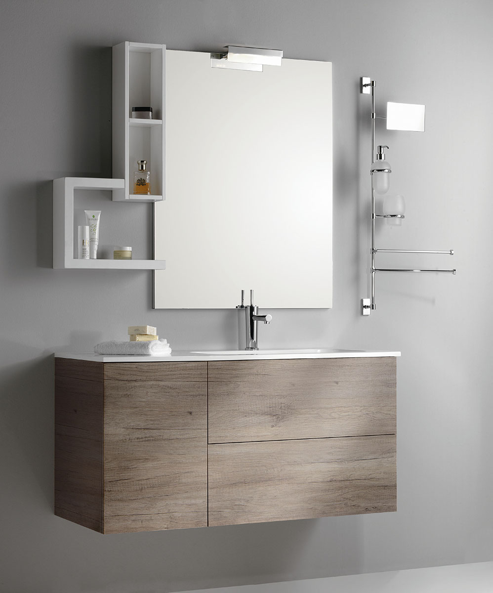 Base porta lavabo con due cassettoni da 70 cm e base laterale ad un’anta da 35 cm Specchio a giorno, Pensile a giorno da 53 cm, mensola e lampada. Profondità mobile 48 cm.