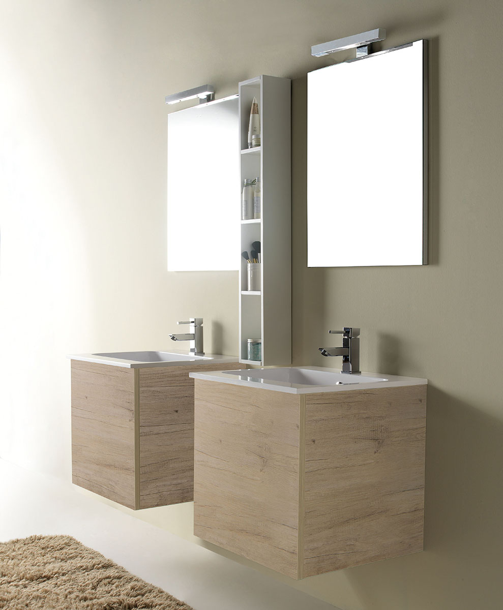 Due Basi porta lavabo con un cassettone da 55 cm. Due specchi a giorno con due lampade, e pensile a giorno h 159.