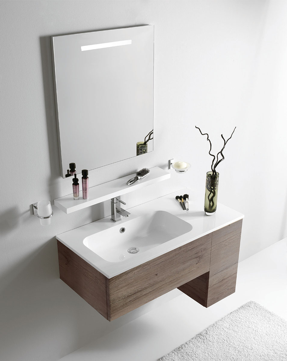 Base porta lavabo con un cassettone da 70 cm e base laterale ad 1 anta da 25 cm. Specchio retroilluminato e mensola da 70 cm.