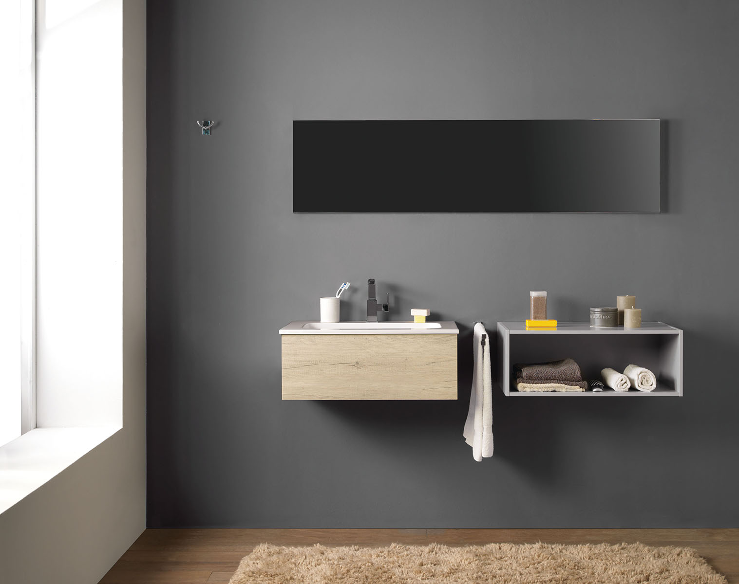 Base porta lavabo con un cassettone da 70 cm e base laterale a giorno da 70 cm. Specchio a giorno da 180 cm,x 40.