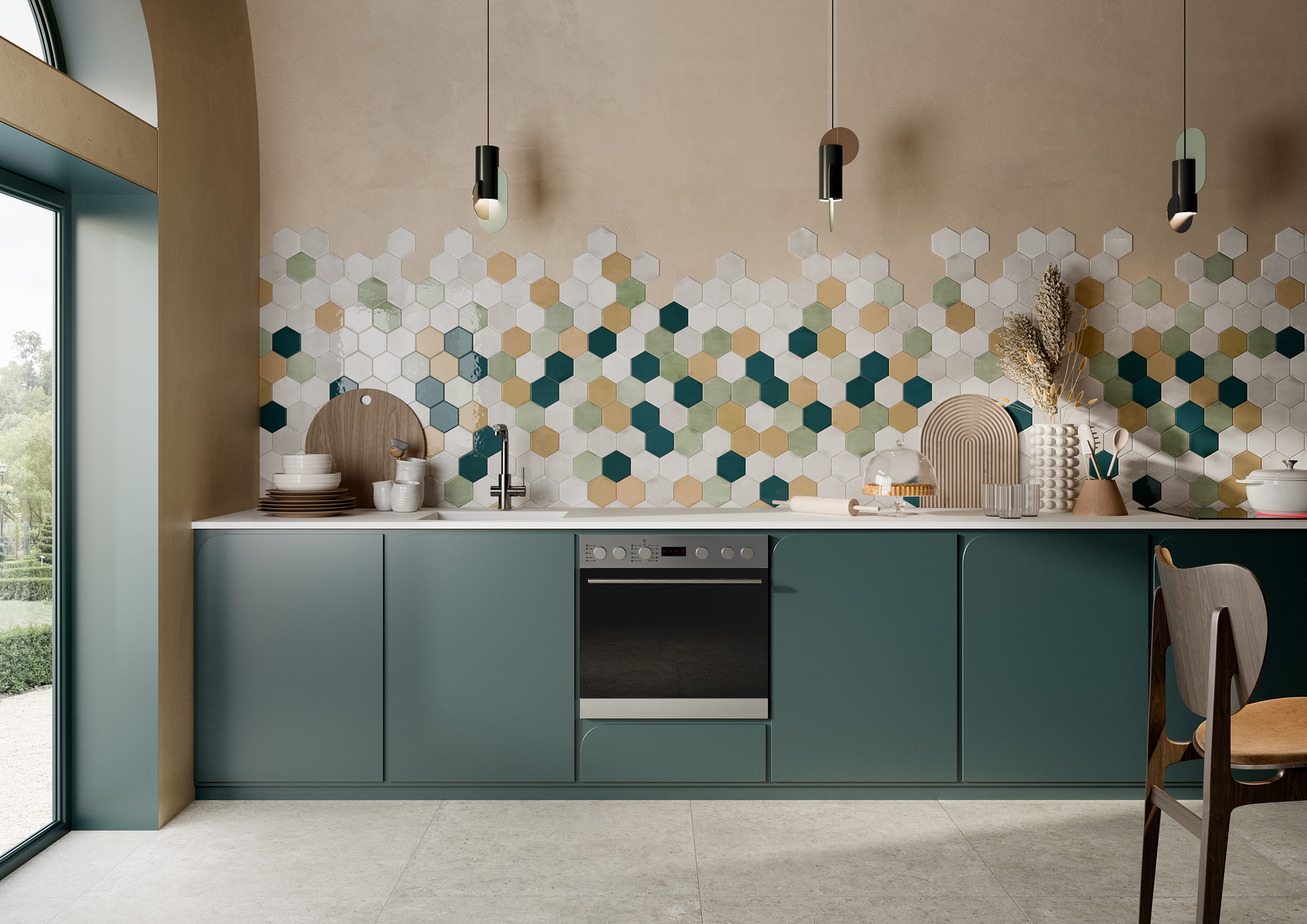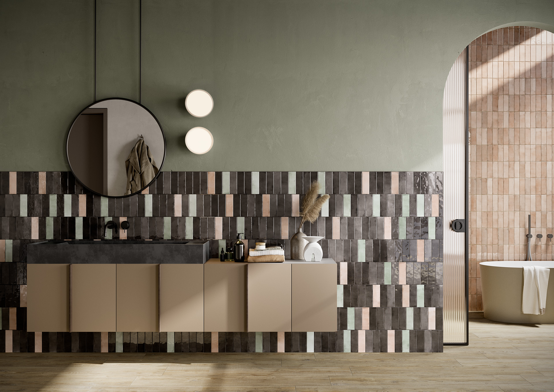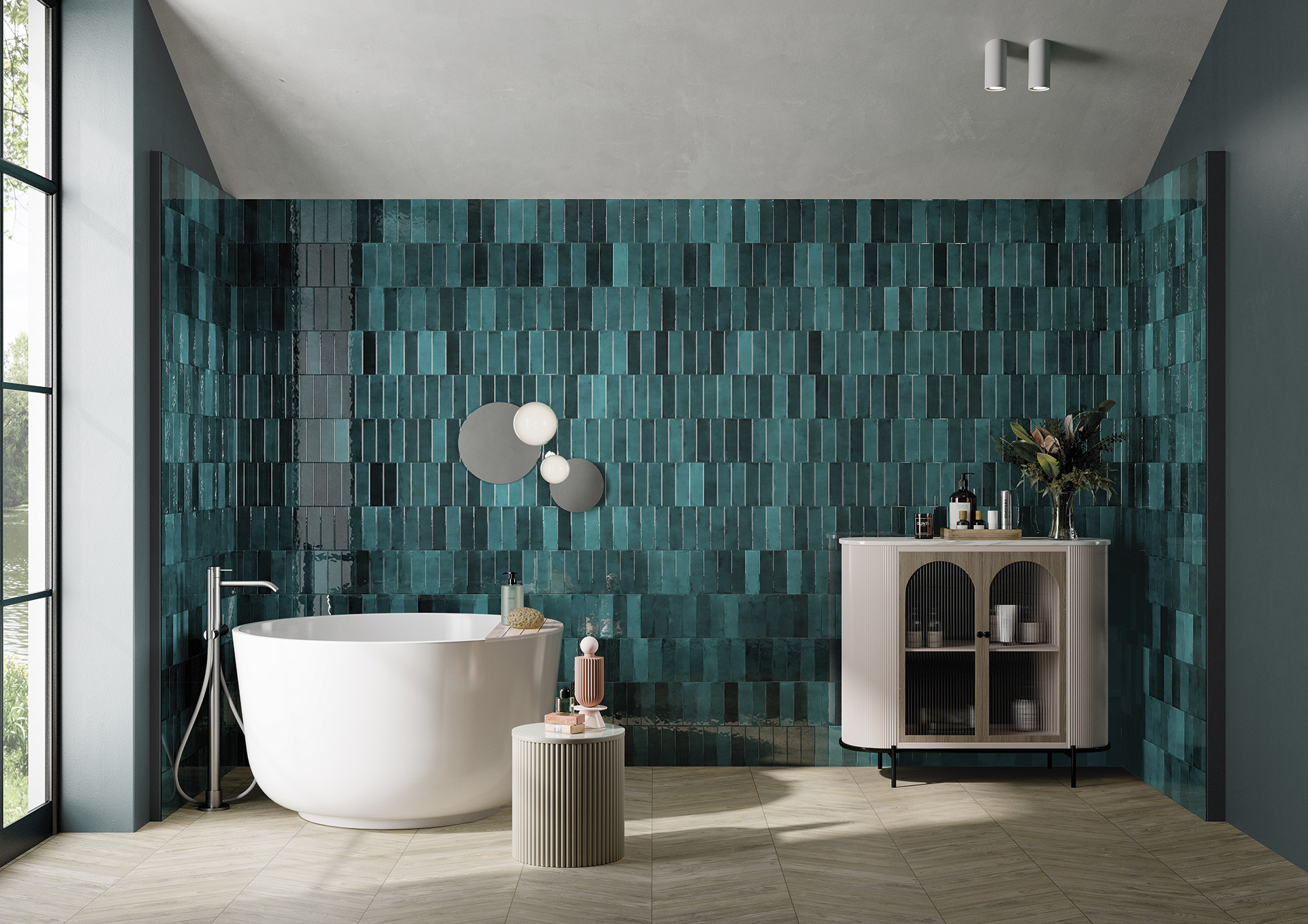 Dodici tinte su superficie lucida con oltre 100 facce per dare ad ogni progetto una sua identità di stile attraverso i suoi molteplici formati in gamma: dal quadrato 10×10 all’esagona 12,4×10,7 fino ai listelli in 5,1×16,1 e 6,5×20 cm.