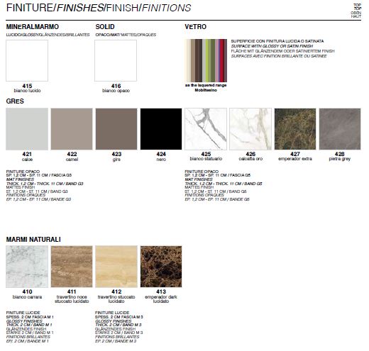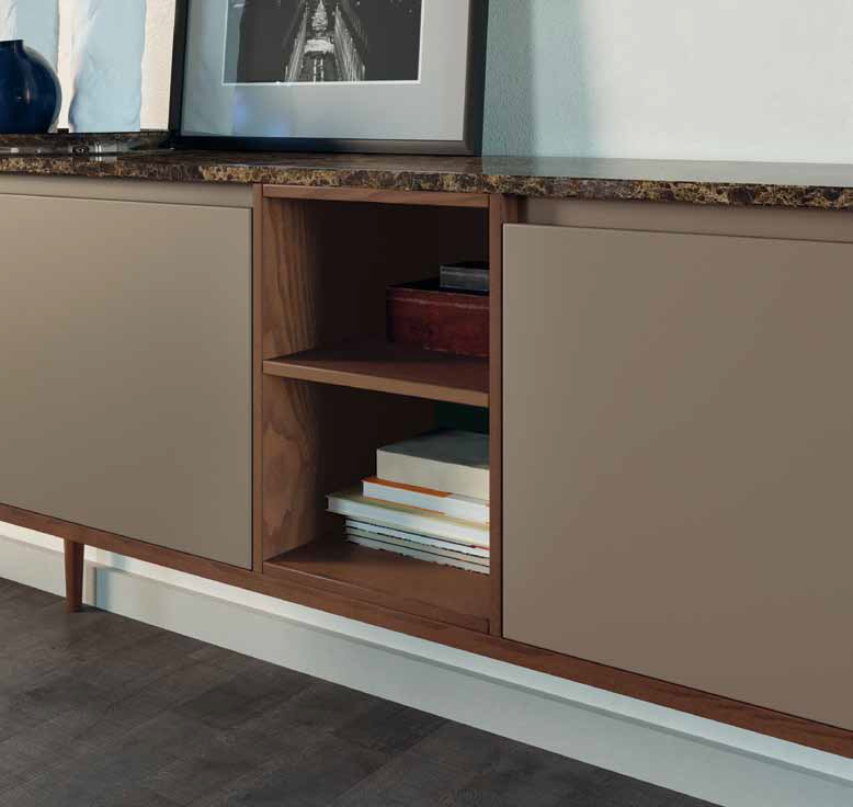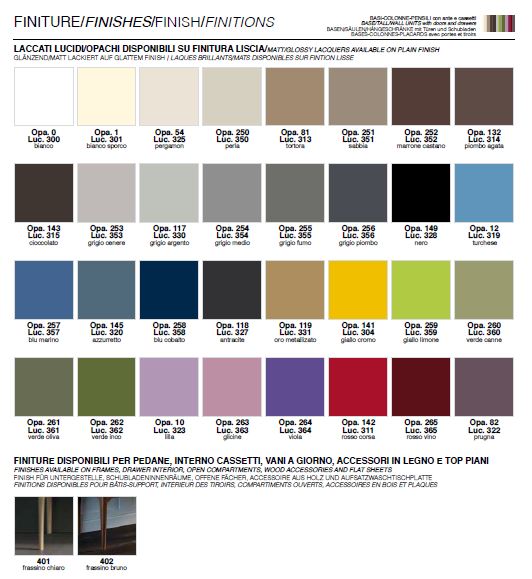 Fianchi, scocca e frontali delle basi sono realizzati nelle finiture laccate/perlate. I pannelli sono in MDF idrofugo.