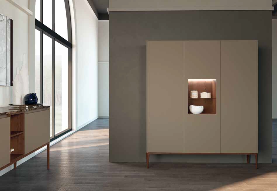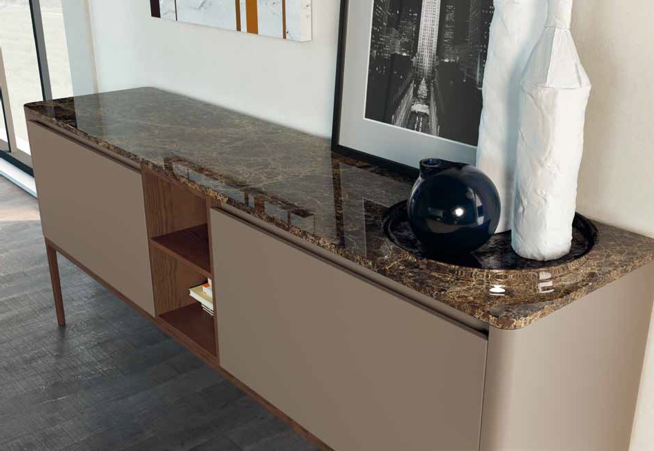 Nelle immagini Composizione da 209 cm finitura laccato Sabbia opaco, Frassino tinto bruno, Top marmo naturale Emperador dark