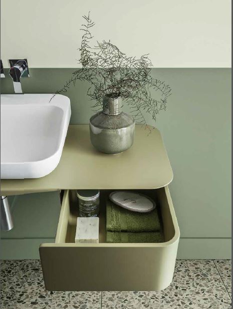 Il cassetto racchiude nel suo disegno, una facile presa per l’apertura ed un profondo contenitore porta oggetti, laccato alche al suo interno.