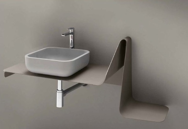 In questa composizione la consolle è un ampio appoggio per il lavabo, è realizzata in metallo verniciato e nella sua struttura include un pratico porta asciugamani ed una mensola sul lato opposto.