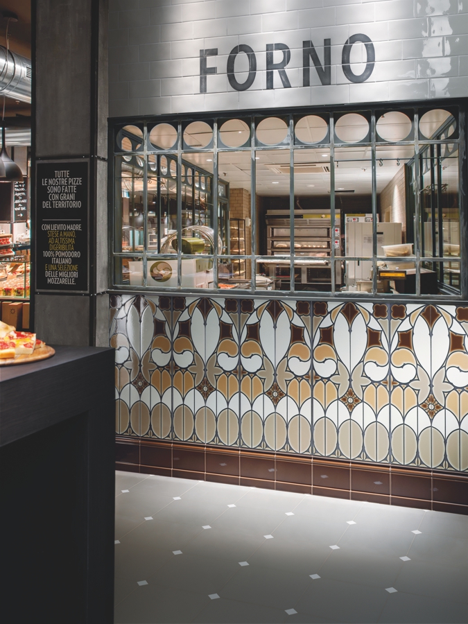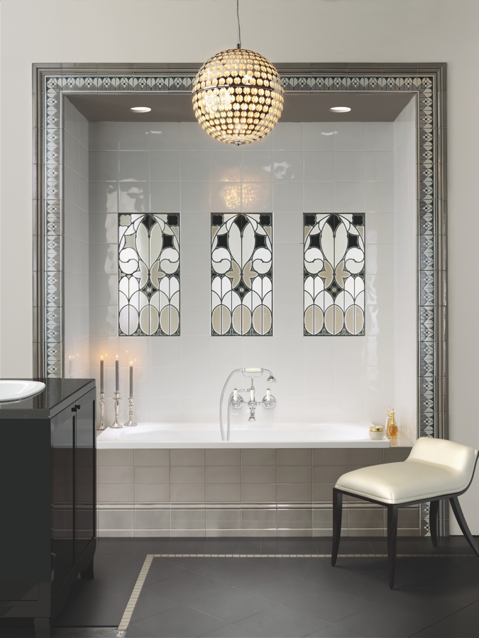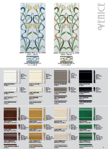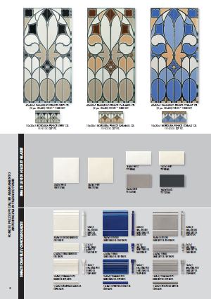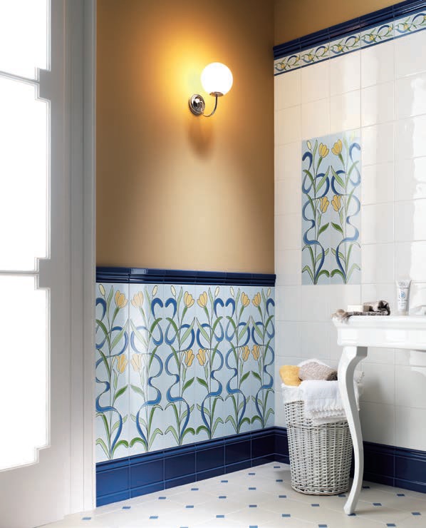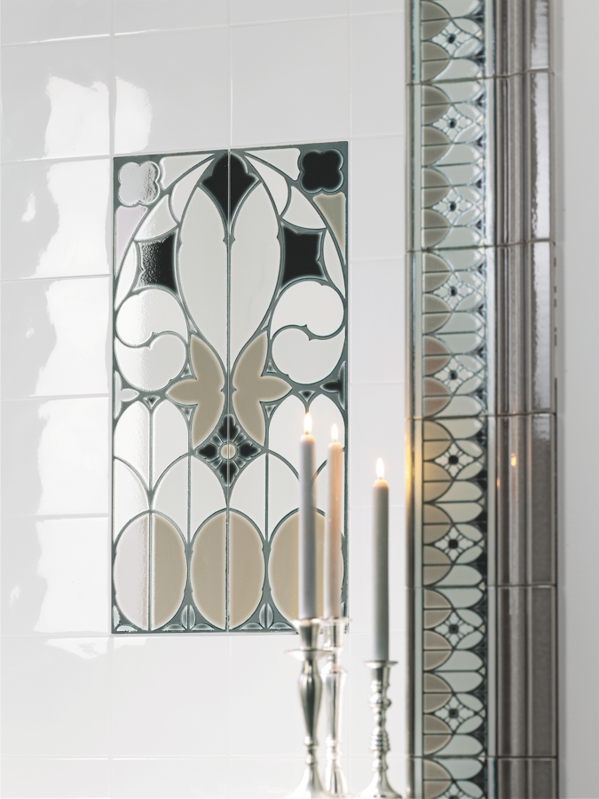 Pannelli decorativi in bicottura tradizionale in pasta bianca con smalto lucido craquelé. Caratterizzata da motivi e colorazioni Art Deco e Liberty.