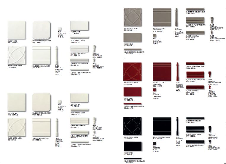 Serie lucida in bicottura tradizionale da rivestimento. Puo’ essere utilizzata nella sua forma essenziale con l’ottagono e tozzetto a contrasto oppure completata con il 10×20 nello stesso colore del tozzetto. Corredata di numerosi pezzi di finitura. Si presta a realizzazioni di ambienti vintage, classici o contemporanei.